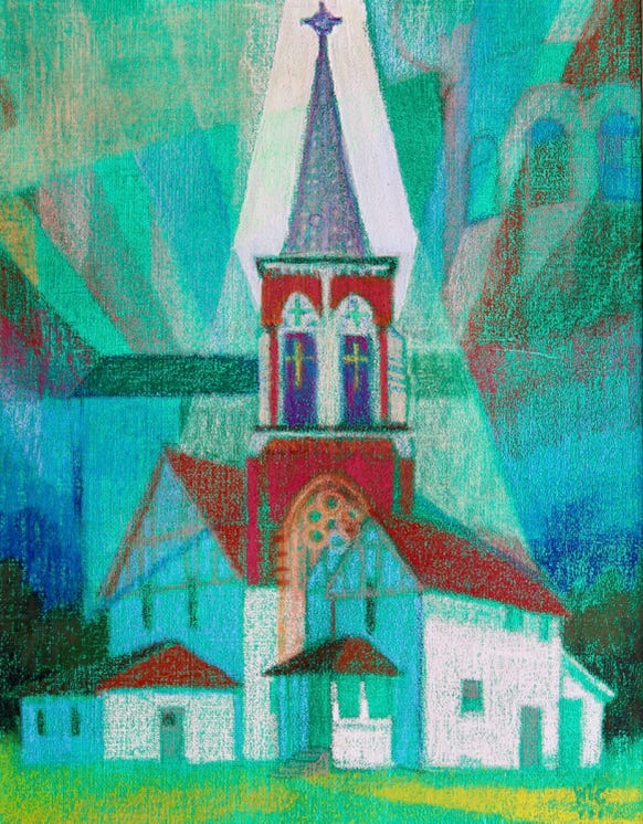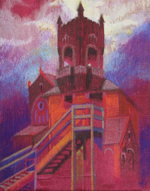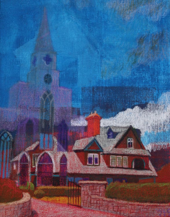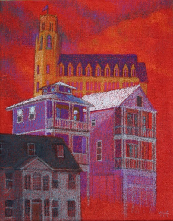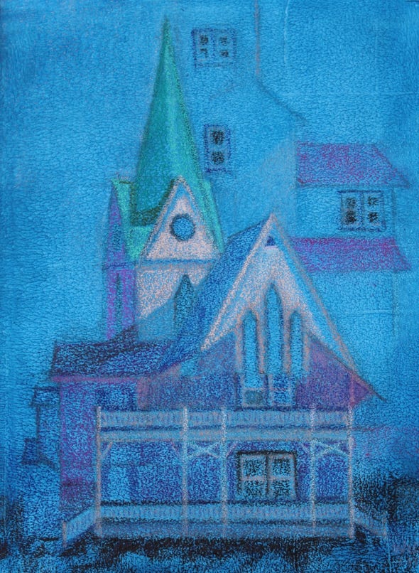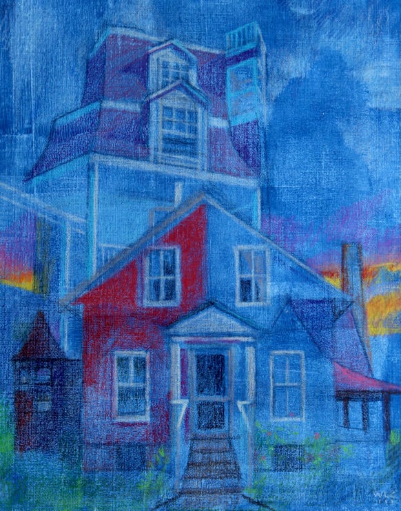 This particular exploration was additionally guided by a switch of medium from oil on canvas to acrylic paint and colored pencils on paper… a technique taught to me by CF Payne.