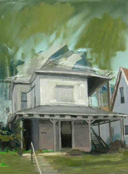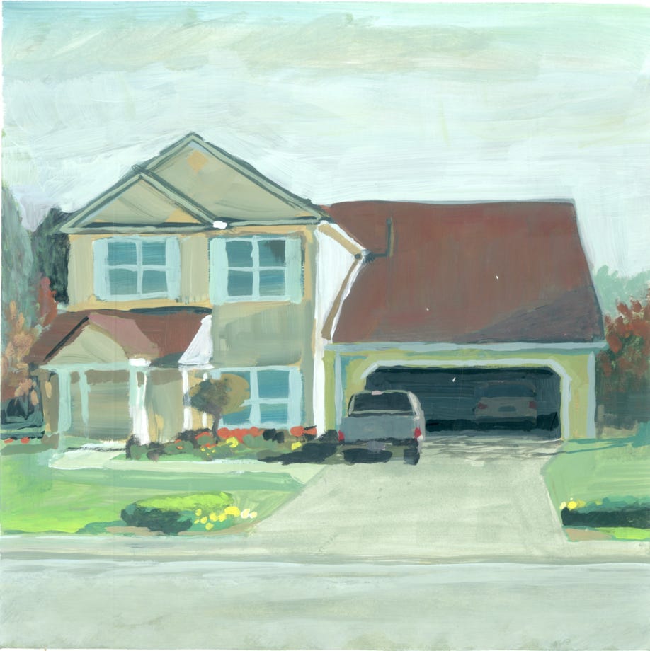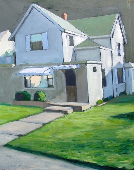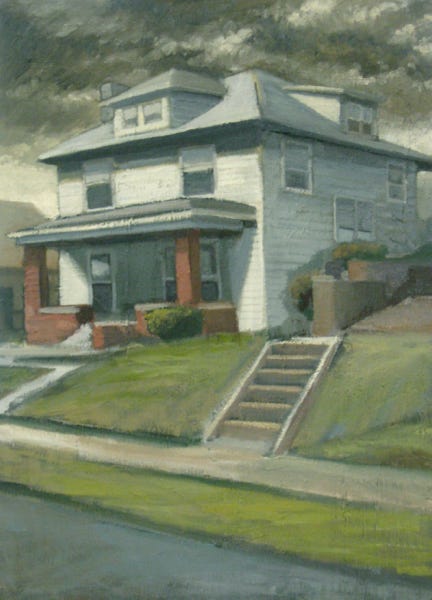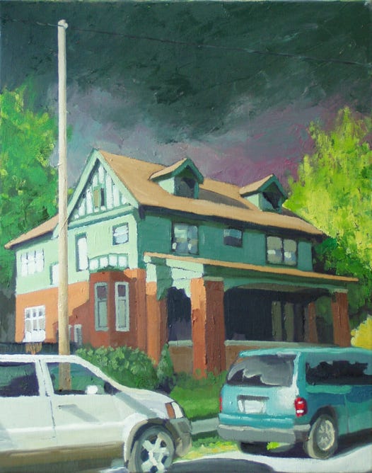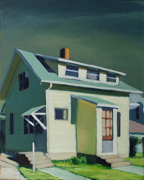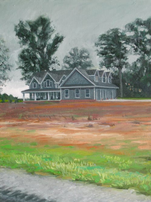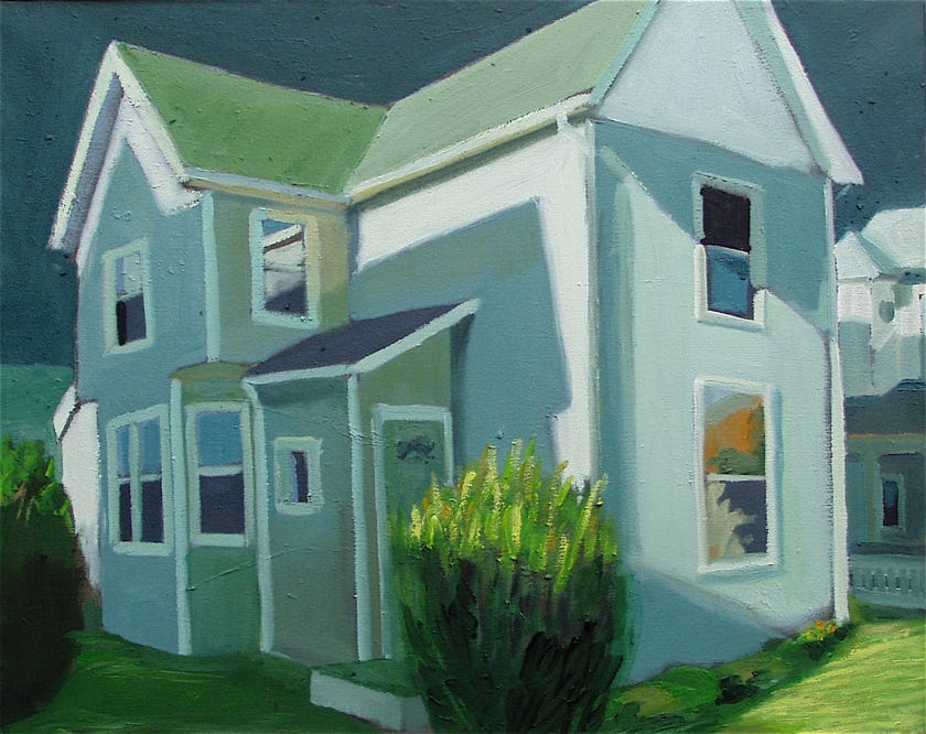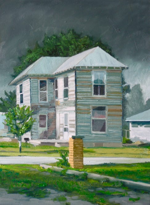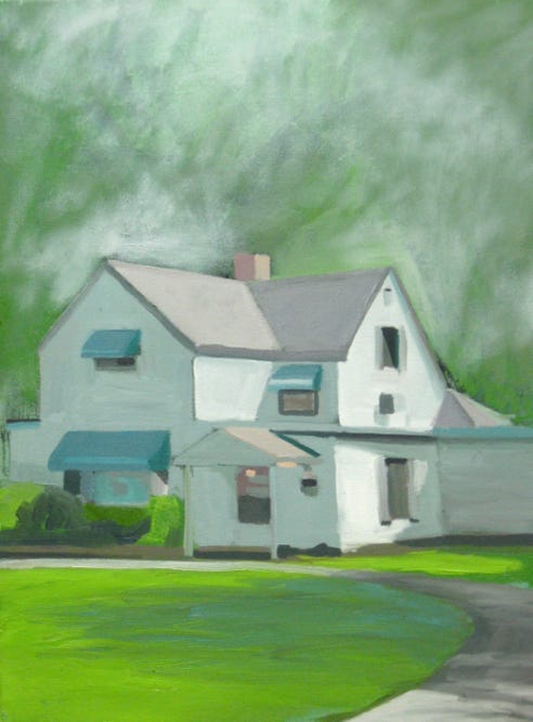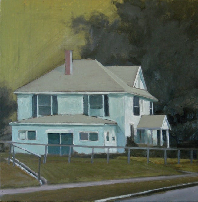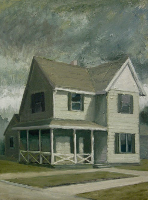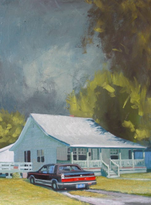 My paintings take their lead from several movements and artists but most prominently Henry Ossawa Tanner inspires my paint quality, Edward Hopper directs some of the mood and lighting that lands on my houses, and JMW Turner, Constable, and the Abstract Expressionists influence my skies.