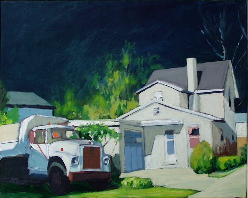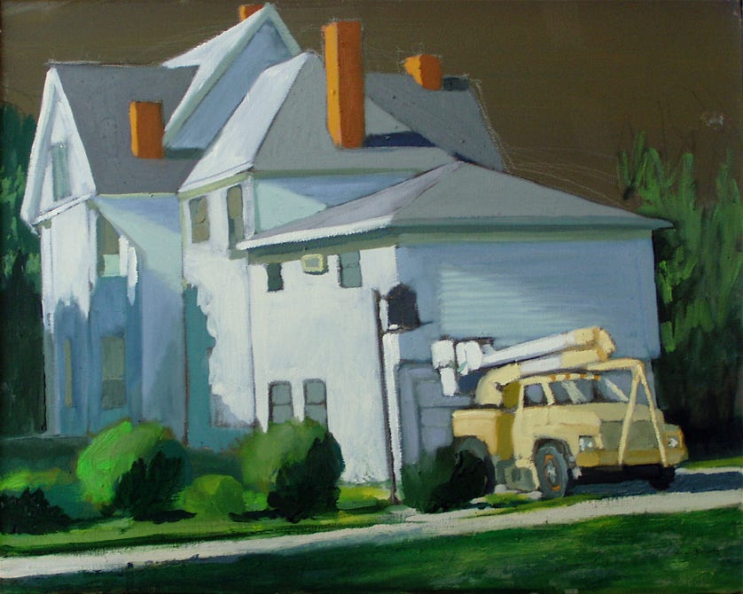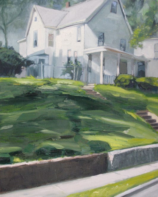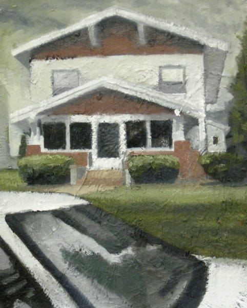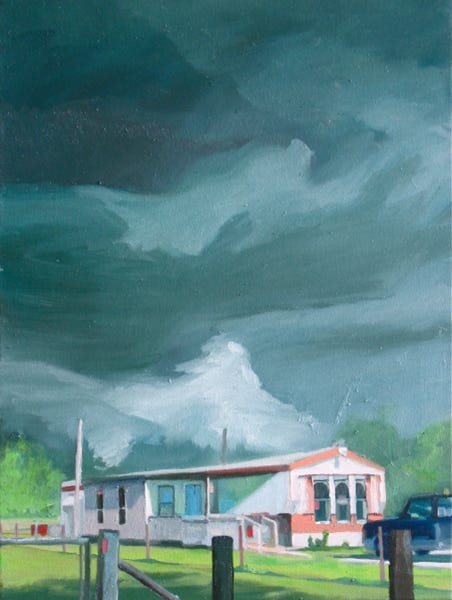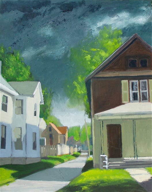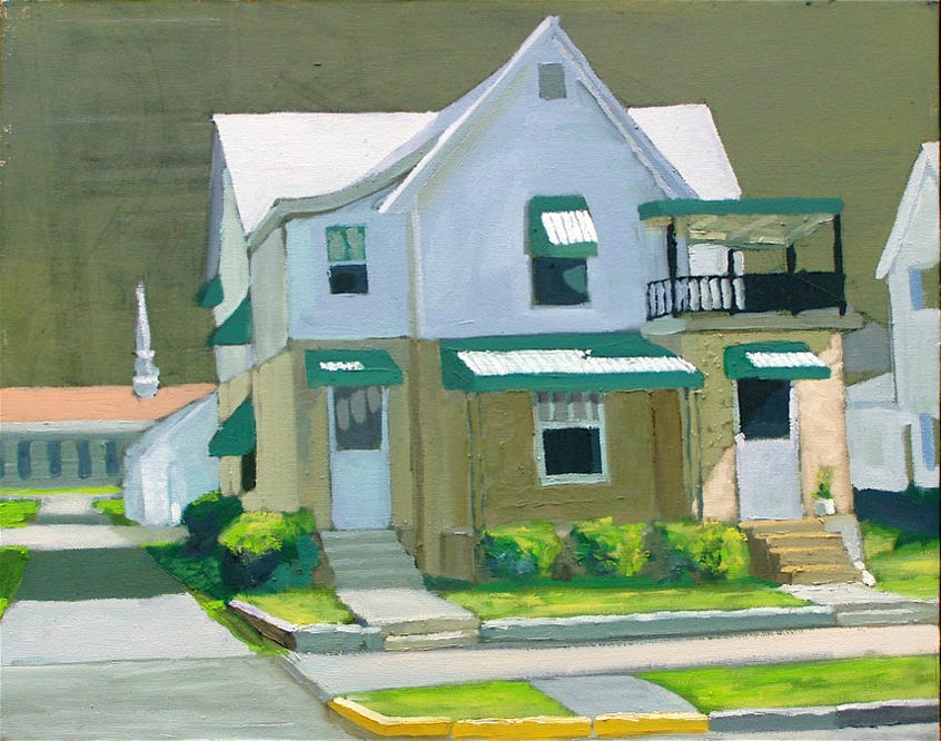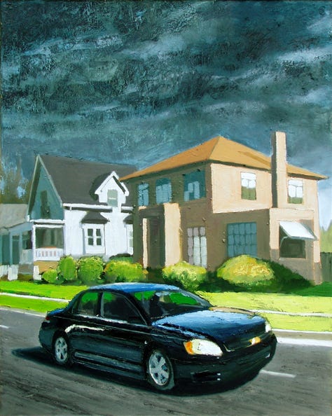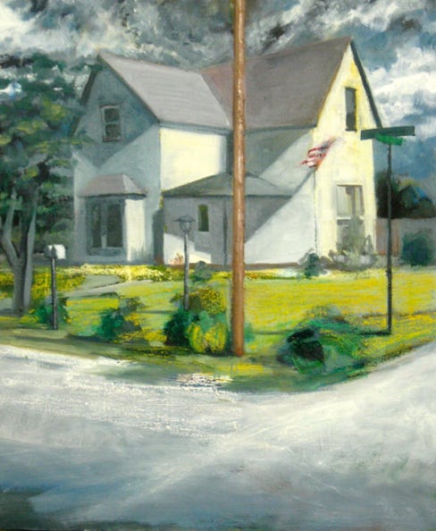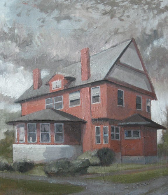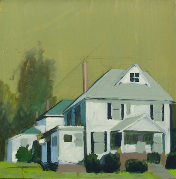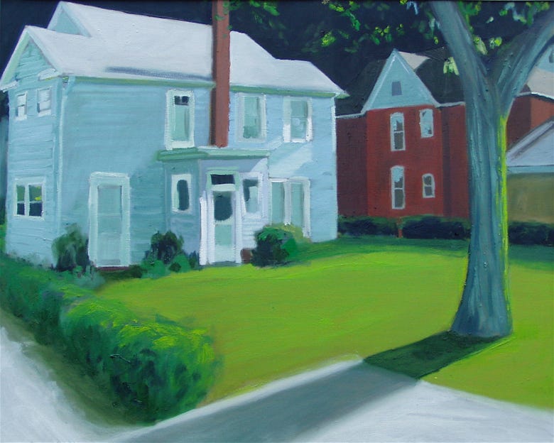 My paintings take their lead from several movements and artists but most prominently Henry Ossawa Tanner inspires my paint quality, Edward Hopper directs some of the mood and lighting that lands on my houses, and JMW Turner, Constable, and the Abstract Expressionists influence my skies.