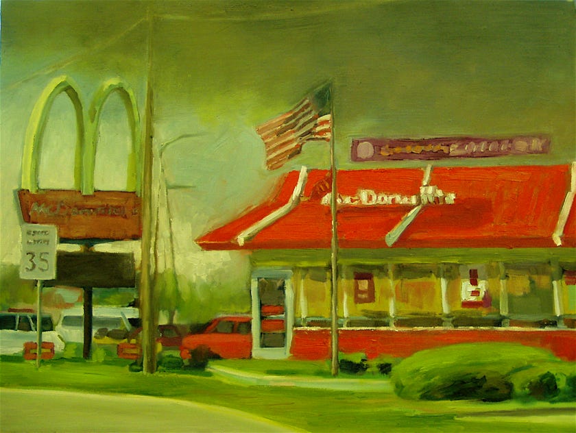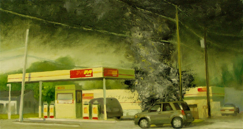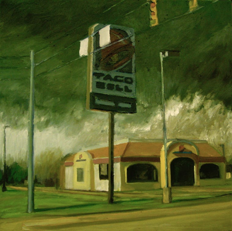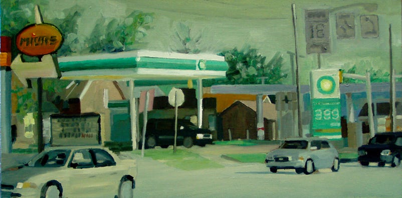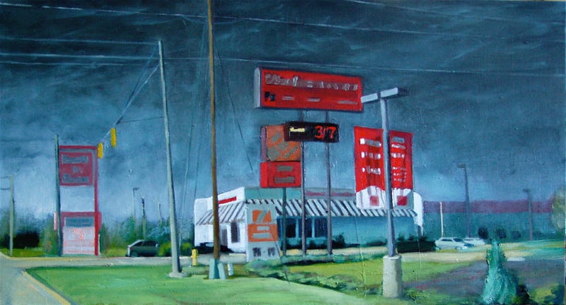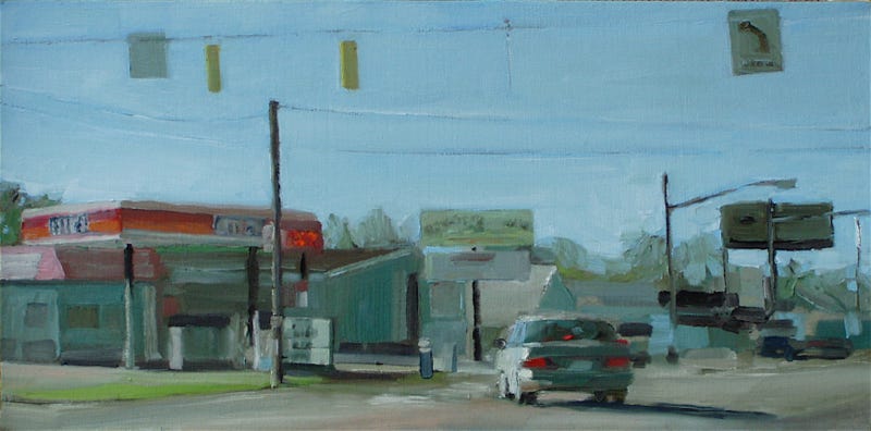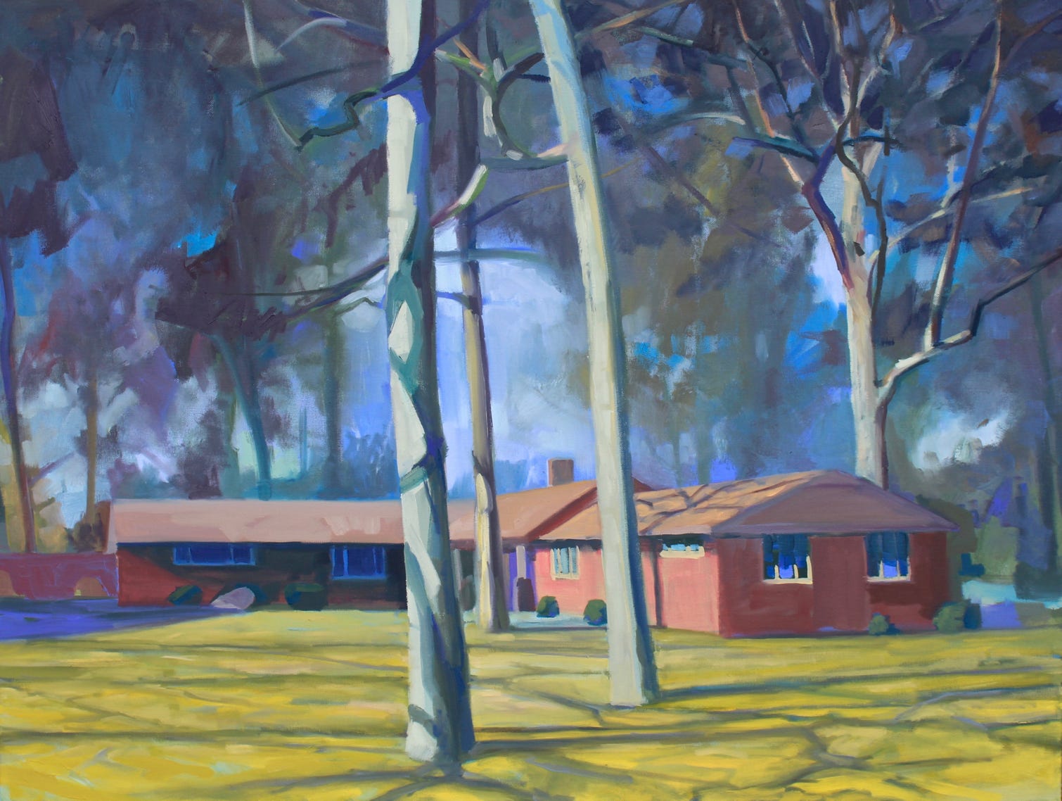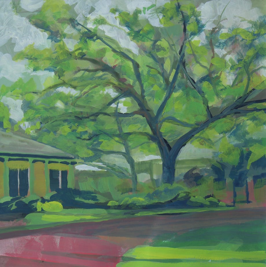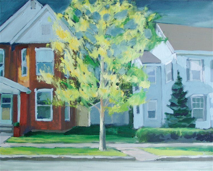 My paintings take their lead from several movements and artists but most prominently Henry Ossawa Tanner inspires my paint quality, Edward Hopper directs some of the mood and lighting that lands on my houses, and JMW Turner, Constable, and the Abstract Expressionists influence my skies.