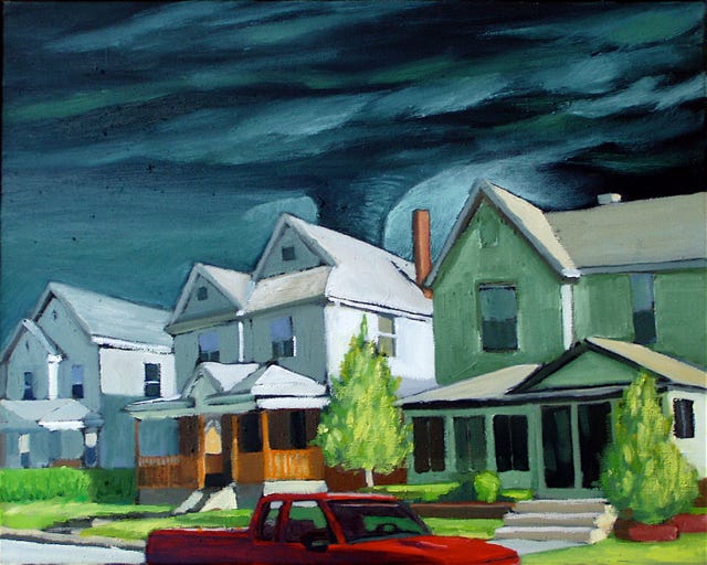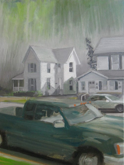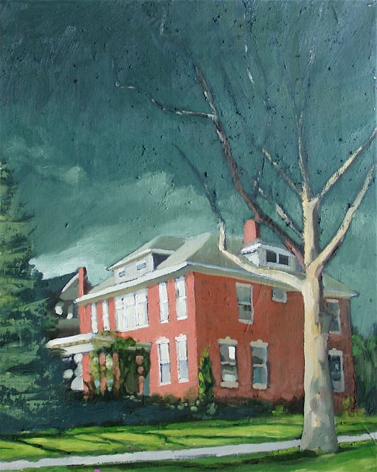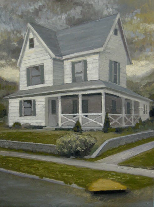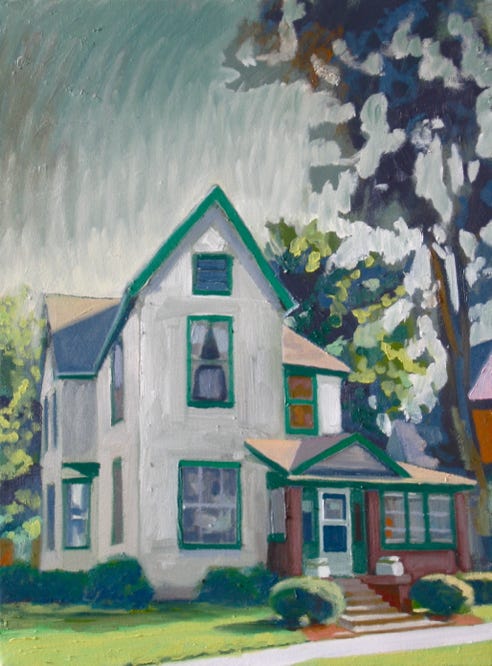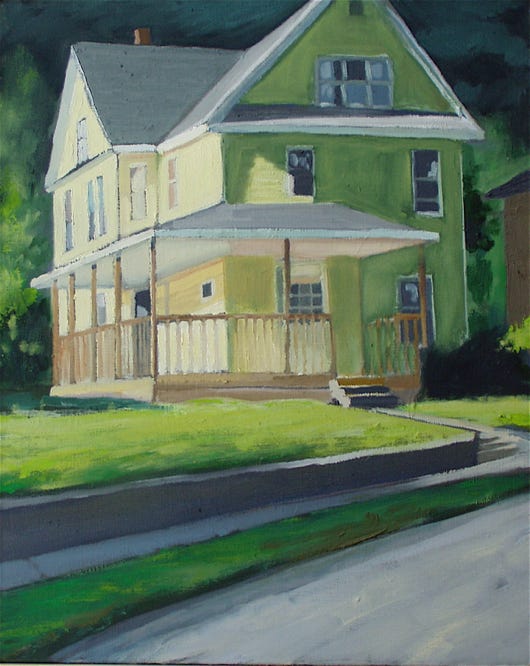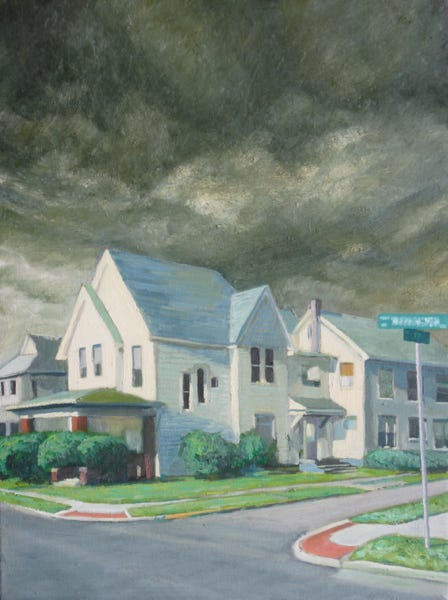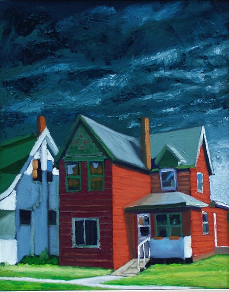 Houses stage our domestic lives. Sometimes their walls conceal the workings within. Sometimes their facades leak visual revelations of the inner goings-on. I painted these houses in a manner that alludes to this truth; more happens within a house than what the casual eye observes from the outside. My eyes and ears tell me that many residences in Marion house much unrest. At night I hear the strife. In the day I take walks through the back-streets of Marion and see litter, neglected yards, and decrepit houses. But even when the yelling dies down and the rubbish washes away these urban dwellings still belie turmoil. So that my paintings resonate with this environment so common in Grant county, I inject the images with painterly brushstrokes, pump up the color contrasts, and stir the skies with my painting knife until they seem to seethe, burn, or explode. I paint, paint, and repaint until the image speaks to this dichotomy; quiet and stable structures house dynamic and intense human interactions.